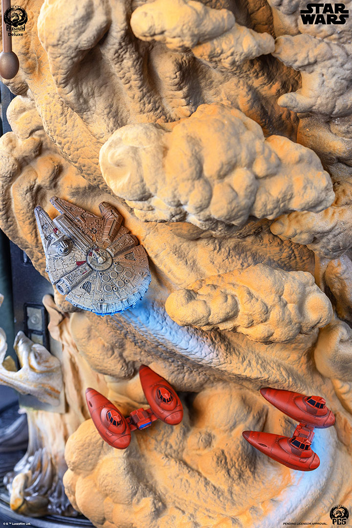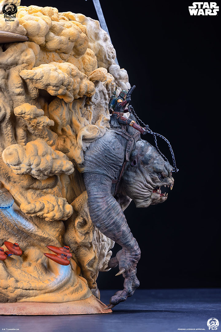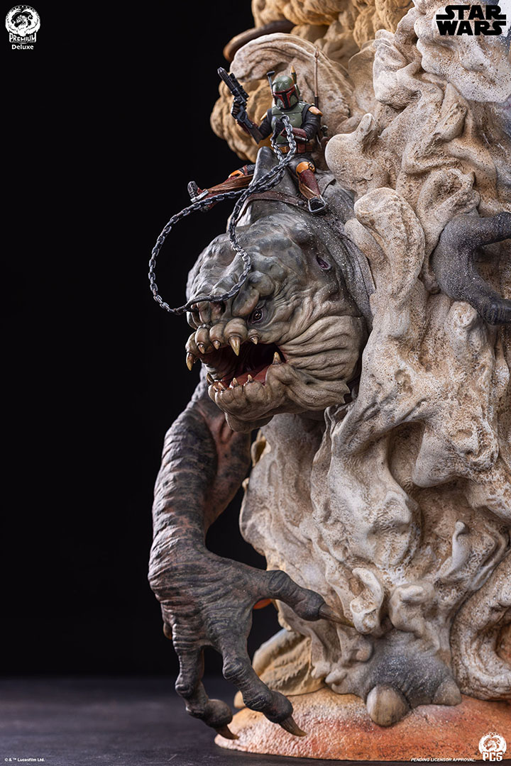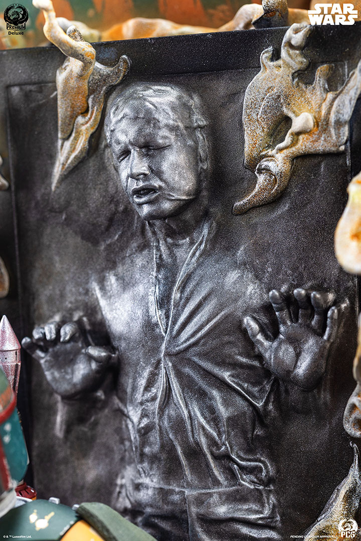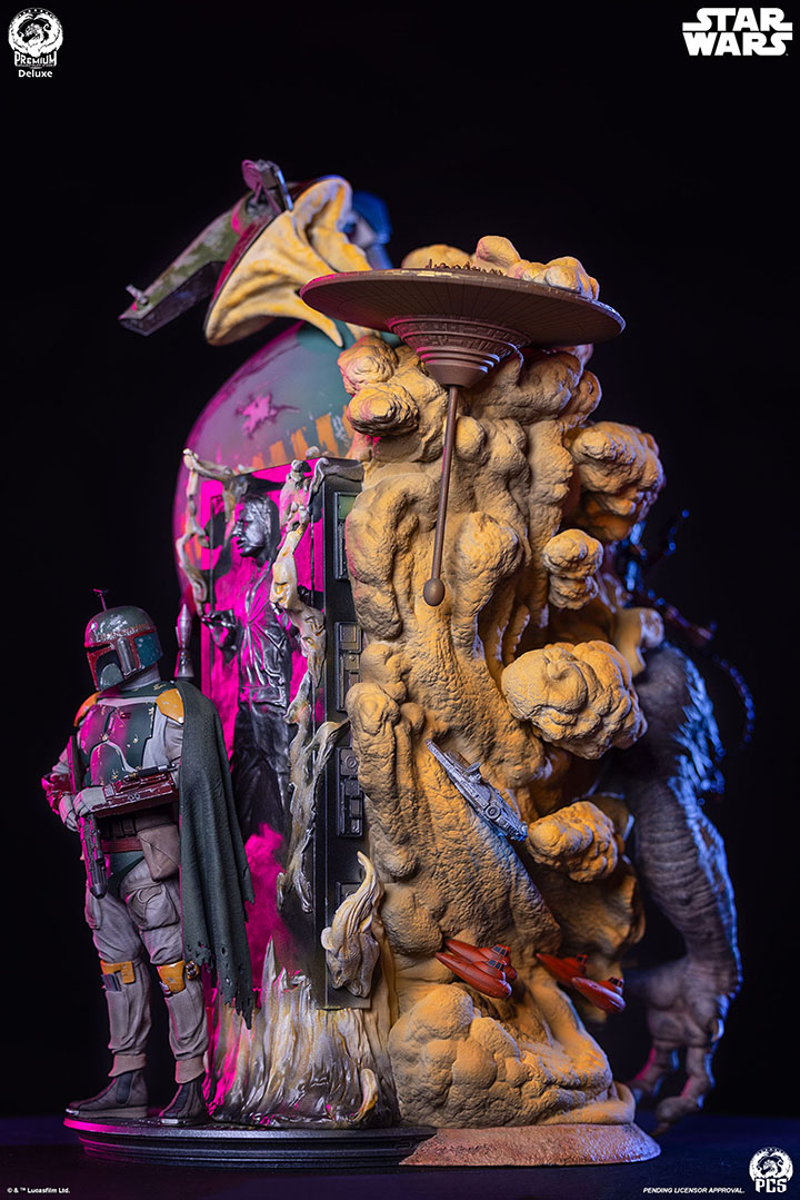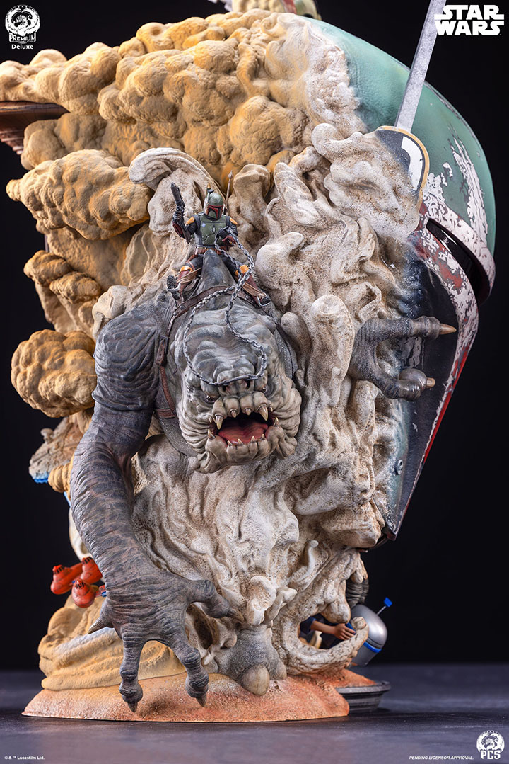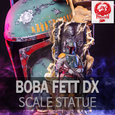 Premium Collectibles Studio is proud to present the Boba Fett - Fine Art Bust Deluxe Edition, a show stopping new collectible depicting the iconic bounty hunter introduced in the 1980 classic, STAR WARS: THE EMPIRE STRIKES BACK¢â. The Boba Fett Fine Art Bust stands over 20¡± high and centers on a faithful recreation of the bounty hunter¡¯s iconic helmet. Surrounding the helmet are beautifully sculpted scenes depicting important moments in this fan-favorite character¡¯s history including the tragedy of his childhood and his pivotal capture of the rebel, Han Solo. The bust also includes a recreation of Cloud City, the floating metropolis that serves as the setting for so many beloved story moments, wreathed in orange clouds that transition to an ethereal vision of the Mandalorian crest seeming to form in the atmosphere. The Deluxe Edition also includes an optional addition, a swap-out sculpted element depicting an older Boba Fett riding atop the fearsome Rancor beast. The Boba Fett - Fine Art Bust Deluxe Edition features LED light up features to add an extra sense of excitement and drama to this already staggering piece. The warm glow emanating from beneath the floors of the carbonite freezing chamber illuminates a highlight of this piece, a statue of the disquietingly stoic Boba Fett standing beside his frozen quarry. Bring home the ultimate prize and add the Boba Fett - Fine Art Bust Deluxe Edition by PCS to your Star Wars¢â Collection today! |