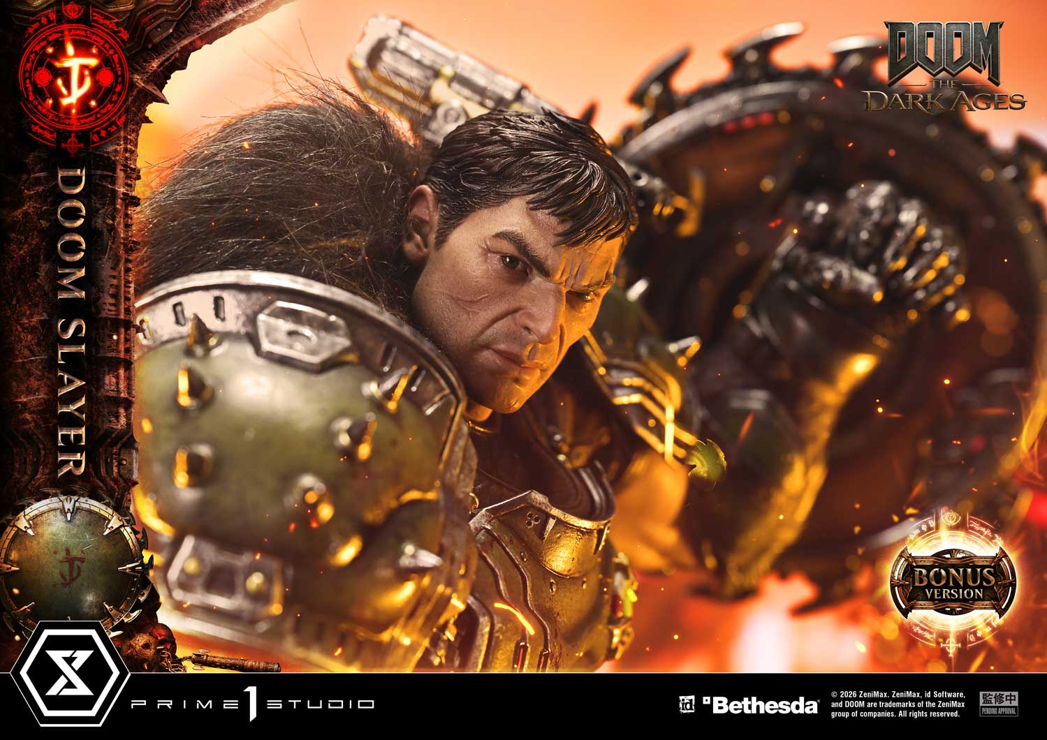 - Two (2) Swappable Heads (Helmeted: Downward-Facing, Right-Facing) - Two (2) Swappable Right Arms (Lowered, Horizontal) - Four (4) Swappable Right Hands for Horizontal (Super Shotgun, Chainshot, Pulverizer, Cycler) - Two (2) Swappable Left Arms (Shield Saw: Normal, Bloody) - LED Illumination (Eyes Inside Helmet, Tether, Chainshot, Cycler) - DOOM: The Dark Ages-Themed Base with LED Illumination - Two (2) Swappable Soldier Heads (Damaged, Undamaged) |
