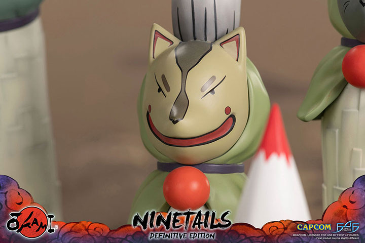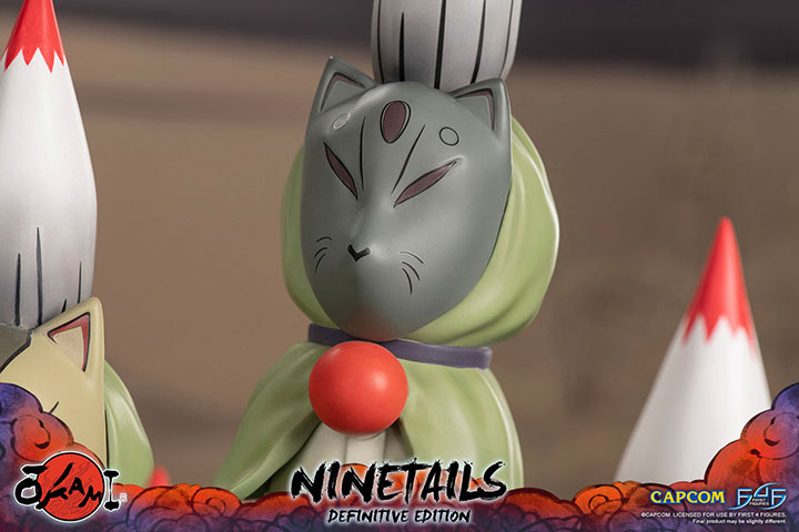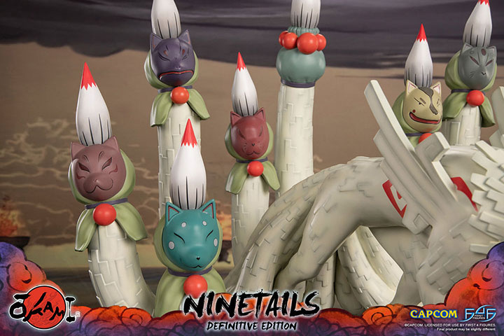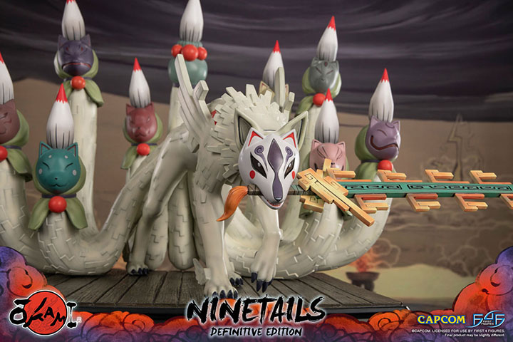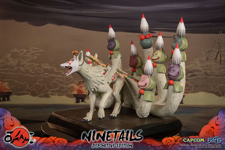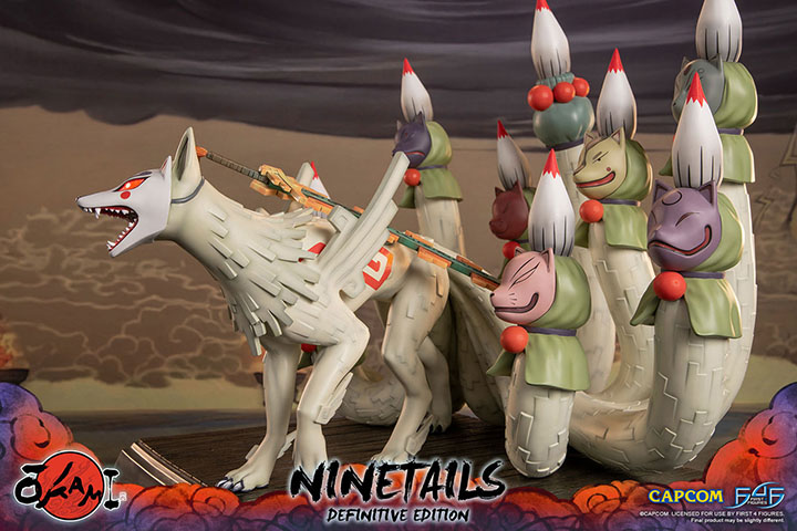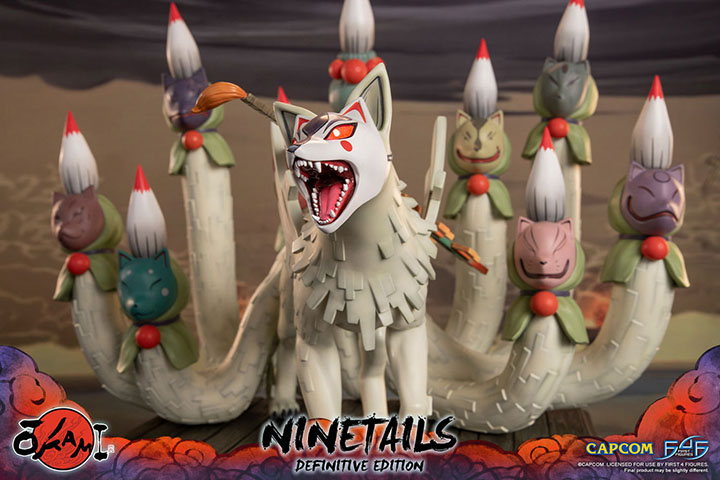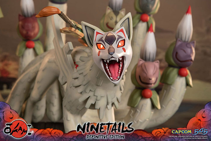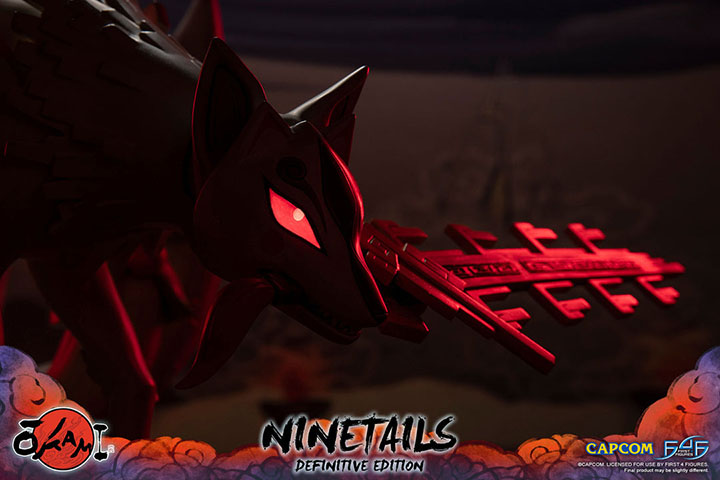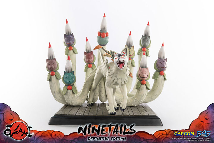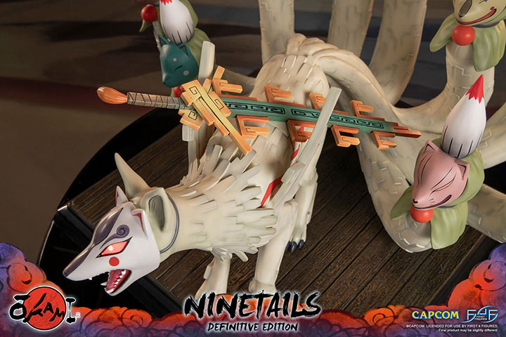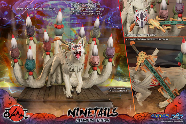 - Okami - Ninetails painted resin statue - Limited Edition Numbering - Authentication Card - LED function for Ninetails¡¯s eyes - Extra interchangeable head with a barking expression - Additional Ninestrike glaive that can be placed on its back |