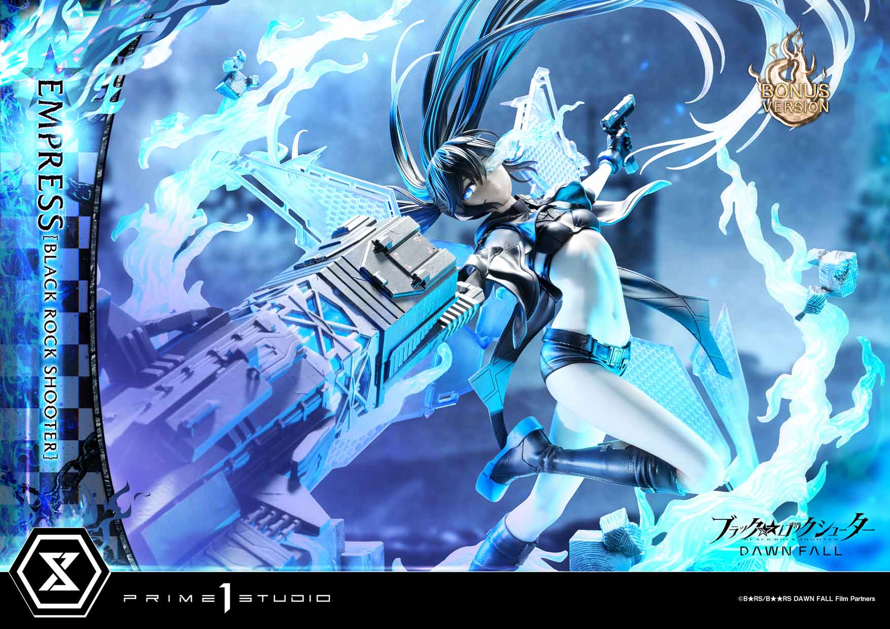 - BLACK ROCK SHOOTER DAWN FALL-Themed Base - One (1) Swappable Left Hand (Bare Hand) - LED Illumination (Eyes, Coil Gun, Effect) - Background Stand |