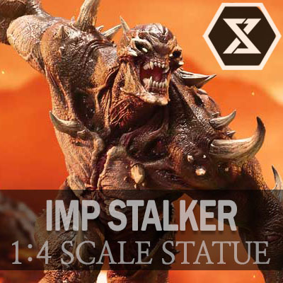 Imp Stalker - Two (2) Swappable Heads (Damaged, Undamaged) - One (1) Swappable Pair of Hands (Hell Surge) - LED Illumination (Undamaged Head, Hell Surge, Claws) - DOOM: The Dark Ages-Themed Base with LED Illumination