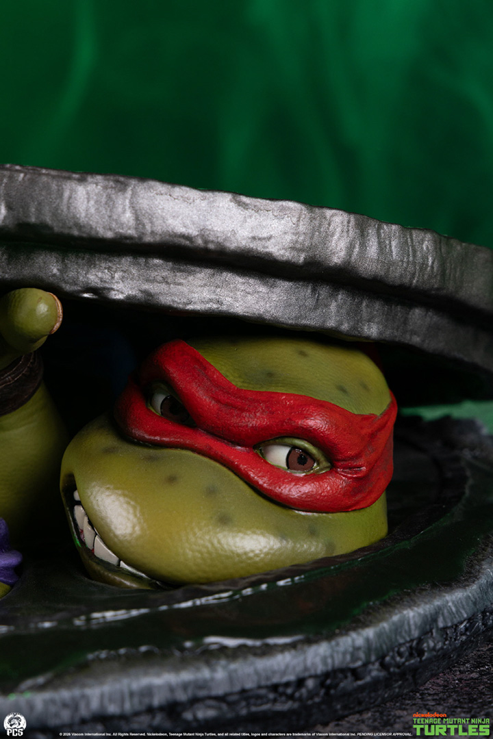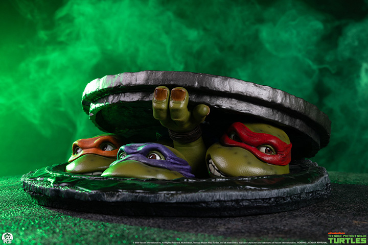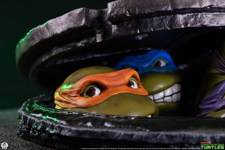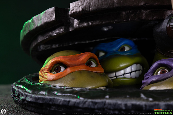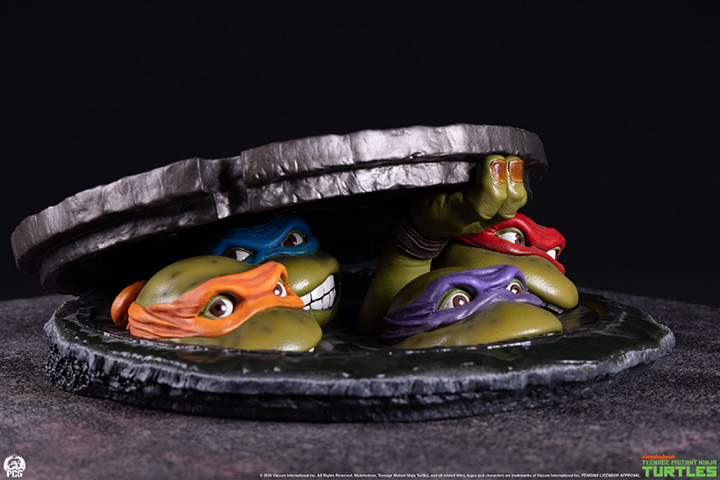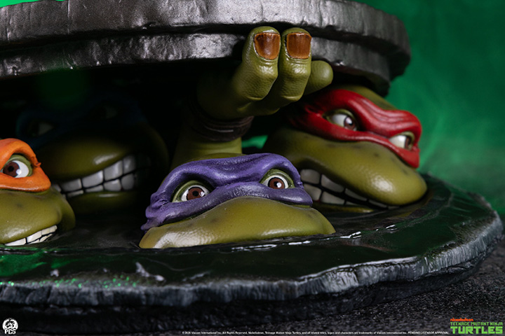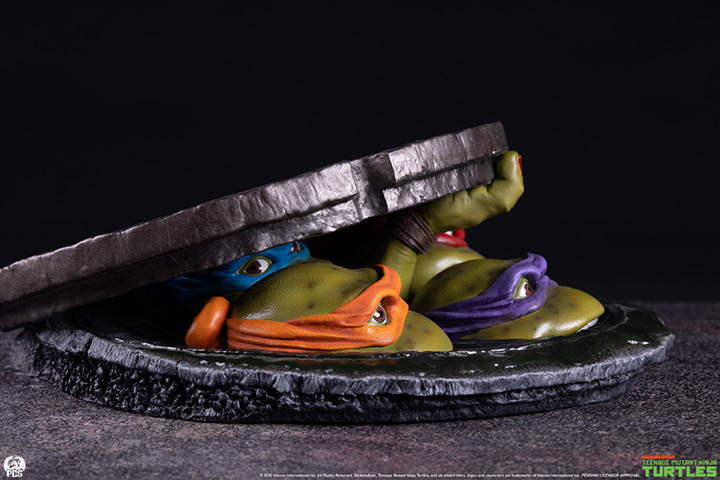 Premium Collectibles Studio is proud to present the TMNT Underground 1:4 Scale Tabletop Edition, a new quarter scale collectible that makes a stunning addition to any TMNT collection. Fully sculpted by the Kucharek Brothers, this diorama is sure to evoke a sense of 90¡¯s nostalgia. At only 4.5¡± tall with a roughly 11¡± diameter, this 1:4 scale rendition is designed to fit into any collection. Featuring Leonardo, Michelangelo, Raphael and Donatello peering out from their underground lair this diorama features a level of detail and realism in each portrait that brings these fan favorite characters to life like never before. Set into a base featuring a detailed big city manhole, this piece boasts realistic textures, striking deco applications and a translucent green water feature that adds just the right amount of ¡°ick factor¡± to the entrance of an underground sewer lair. Add some street cred to your TMNT collection and pick up the TMNT Underground 1:4 Scale Tabletop Edition by PCS today! |